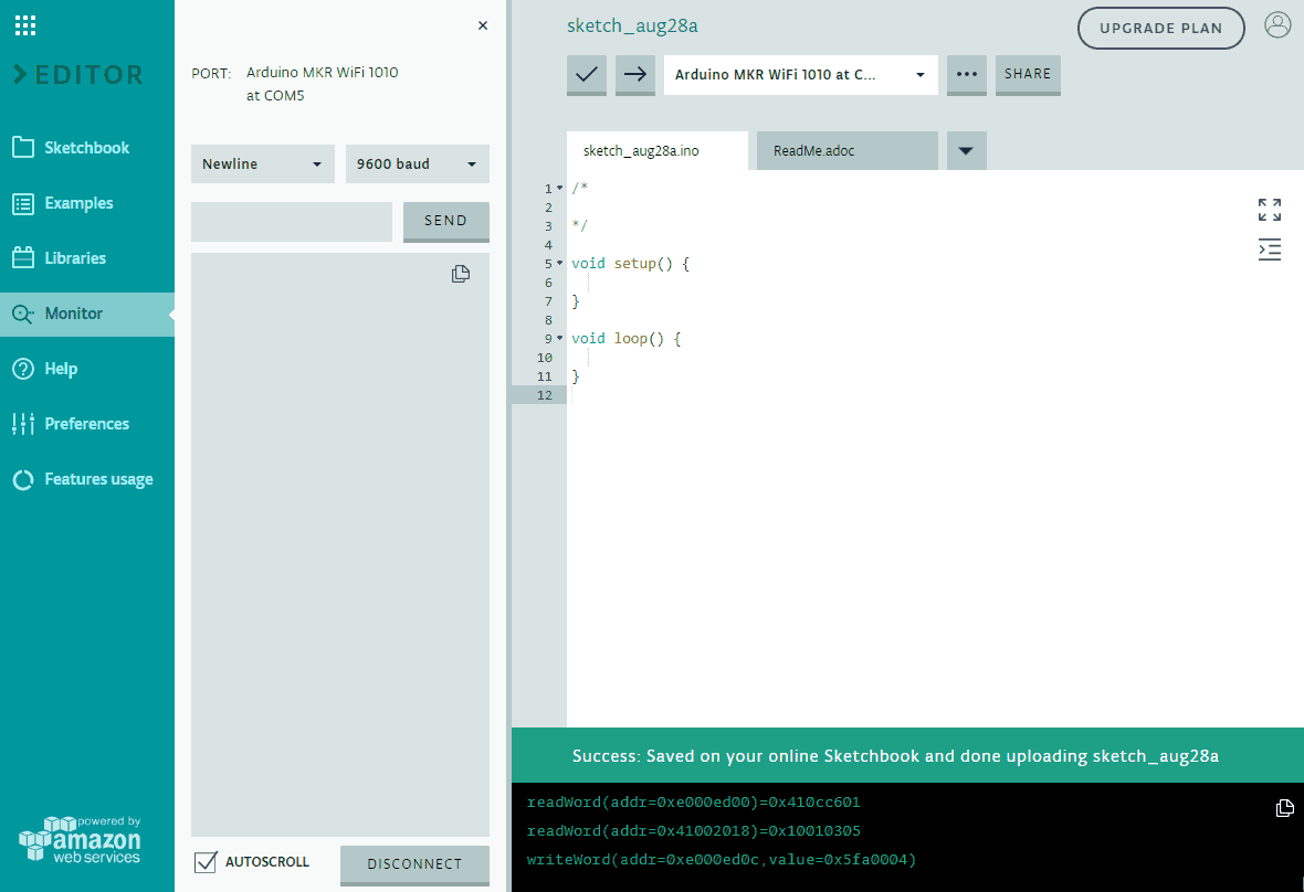 The online editor has the terminal embedded in the UI, as shown in the following image.