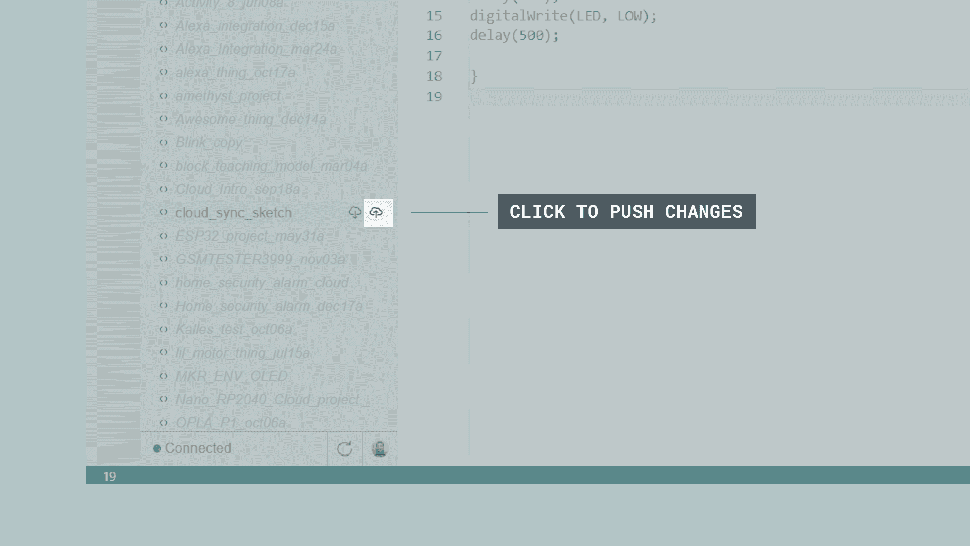 When we are finished editing, we need to push it back to the Arduino Cloud. This is done by clicking the cloud with an arrow pointing up icon.