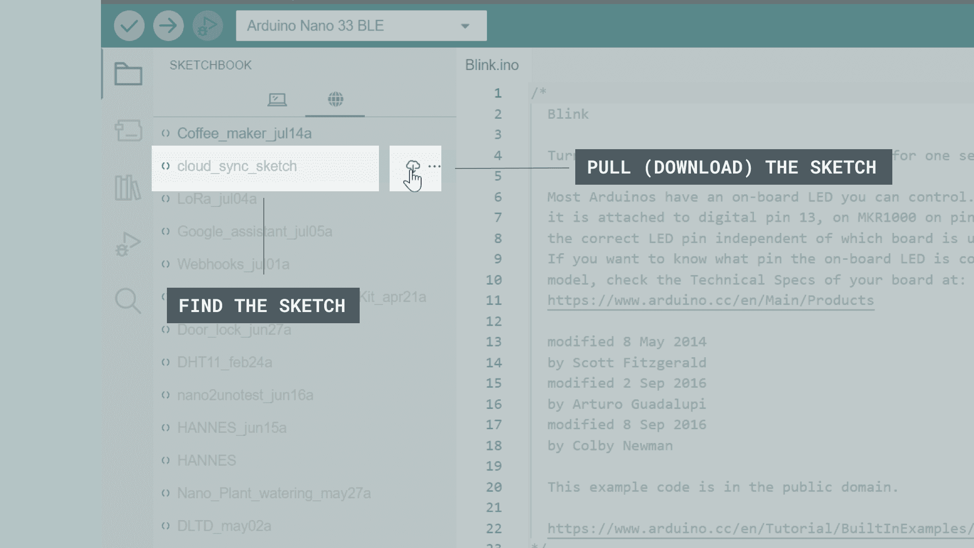 • Backup your code: Your sketches are too important to risk losing them! And life is too short to make copies manually. With Remote Sketches you only need one click and they will be saved in the Arduino secure Cloud.