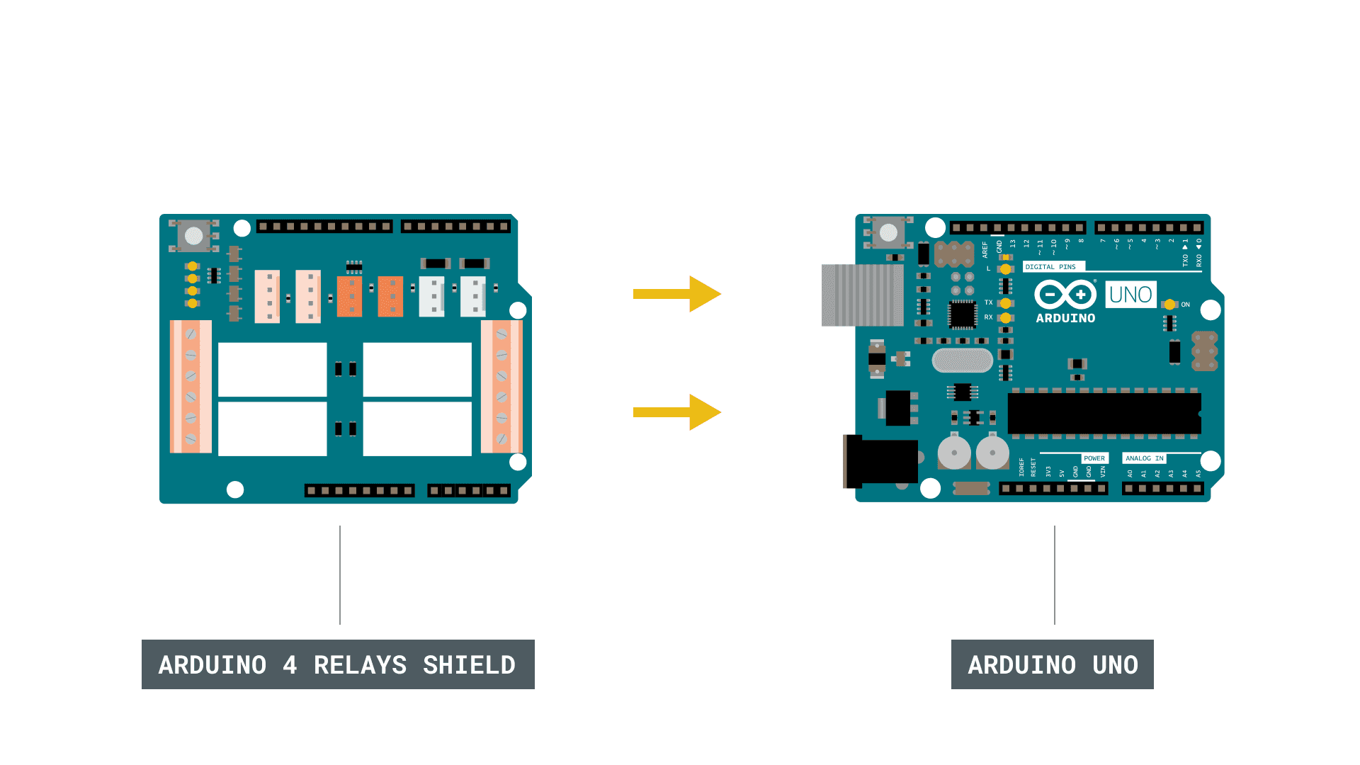 Let's begin by mounting our Arduino 4 Relay Shield on top of an Arduino UNO.