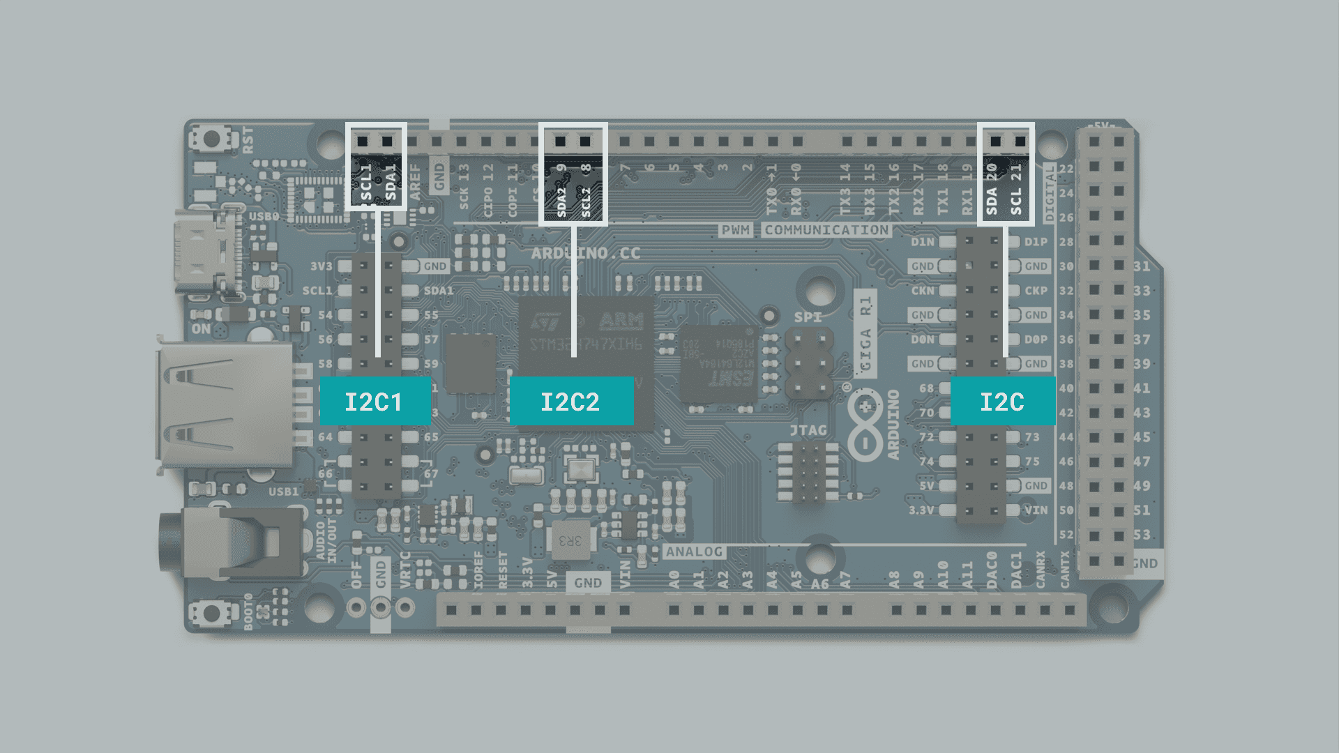 The Arduino GIGA R1 is one of our most feature-packed Arduino boards to date, supported by the same powerful, ML-capable, dual-core microcontroller found in the Pro family's Portenta H7. It features support for display connectors, USB-host, an Audio Jack, an Arducam connector, a CAN bus, 4 UART Serial Ports, 2 I2C buses, dedicated DAC Pins, and much, much more.