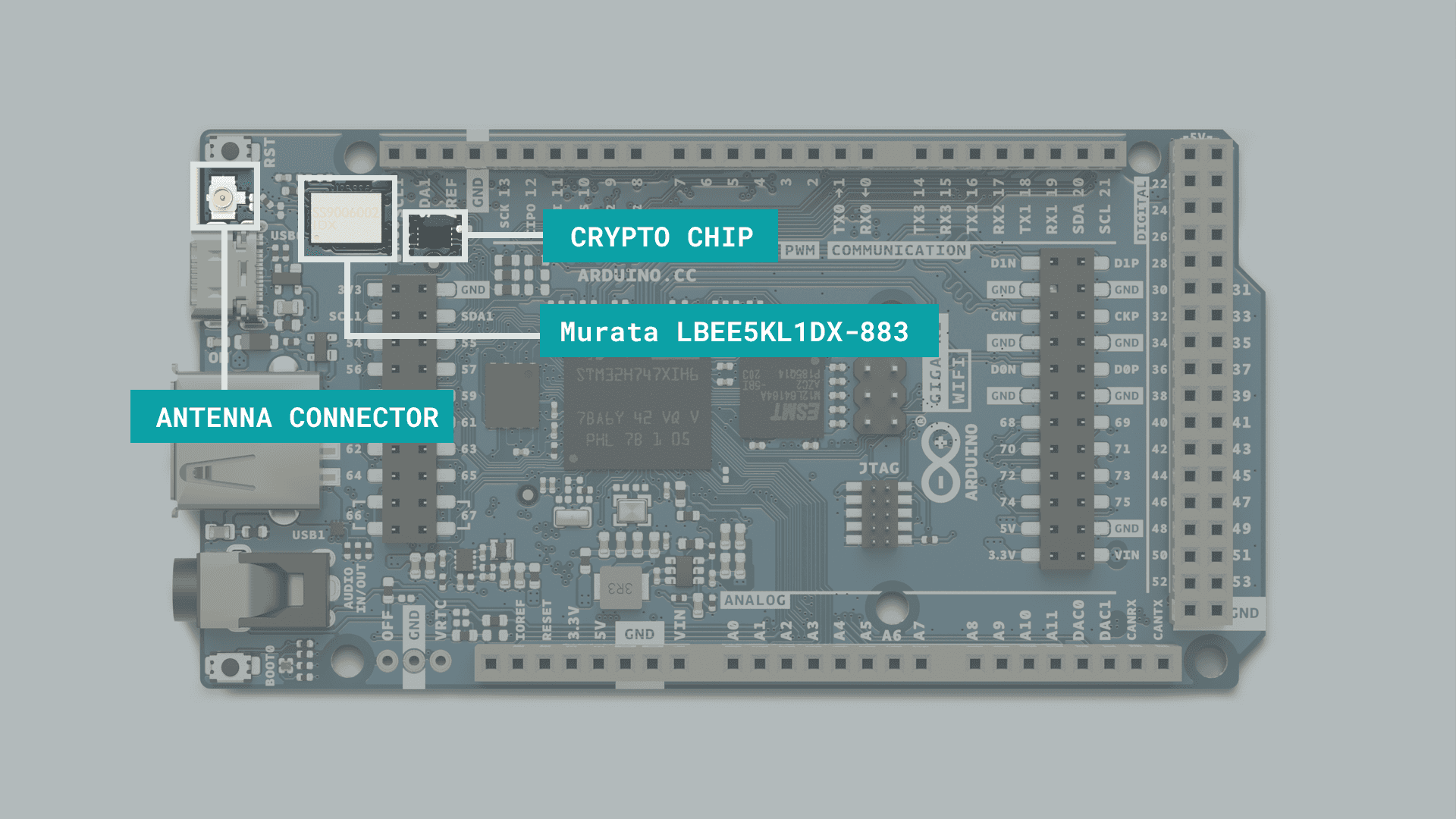 The Wi-Fi® / Bluetooth® module onboard the GIGA R1 WiFi is the Murata LBEE5KL1DX-883. This module does not come with a built-in antenna, but an external antenna is included when purchasing the board.