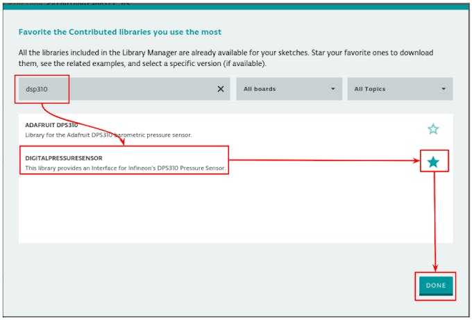 1float temperature;2float pressure;3Dps310PressureSensor.measureTempOnce(temperature, dps310_oversampling);4Dps310PressureSensor.measurePressureOnce(pressure, dps310_oversampling);