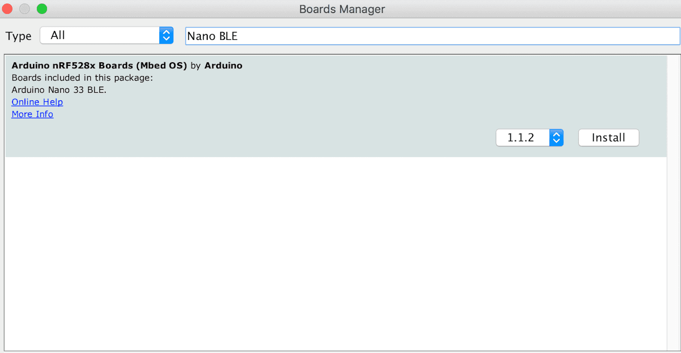 1. First, let's make sure we have the drivers for the Nano 33 BLE boards installed. If we are using the online IDE, there is no need to install anything, if you are using the offline IDE, we need to install it manually. This can be done by navigating to Tools > Board > Board Manager..., search for Arduino Mbed OS Nano Boards, and install it.