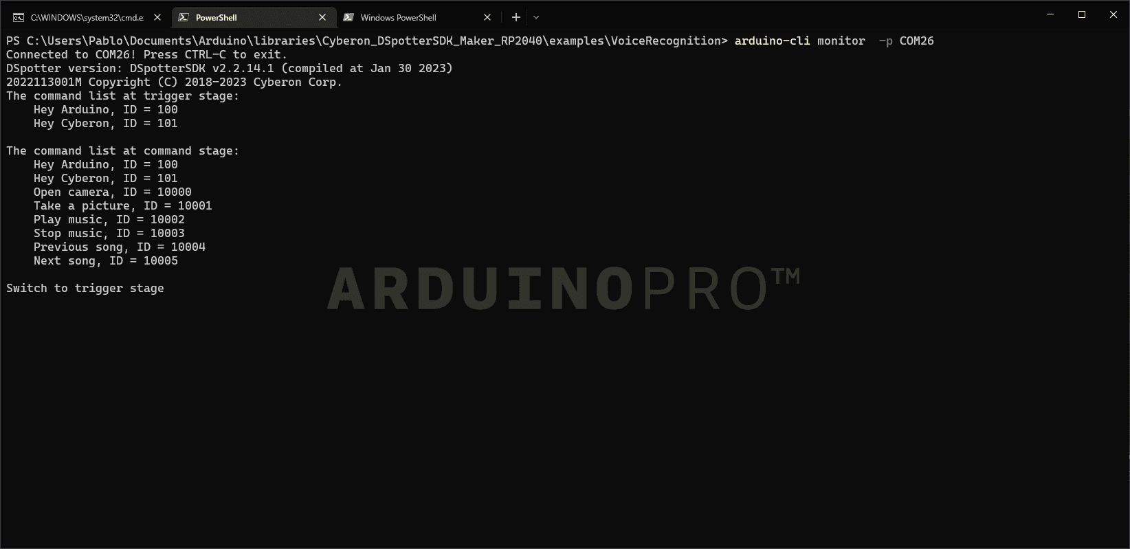 tab and upload the sketch.You can now open the Serial Monitor where you can see the available commands that the CyberonSDK recognizes.