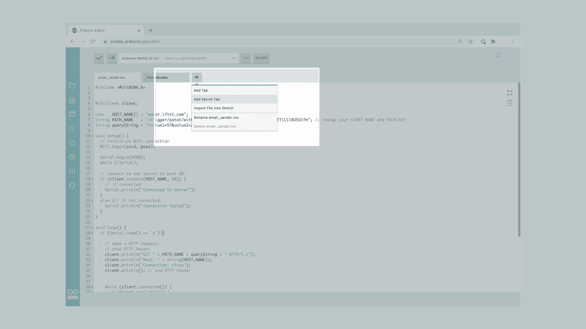 Let's start by creating a secret header file to store our credential for the Wi-Fi network which we will connect to. In this way we don't accidentally store our credentials in a code we may share on the internet. To do this, we need to click the downward arrow next to our sketch tab, and click Add Secret Tab. This will create a tab called Secret.
