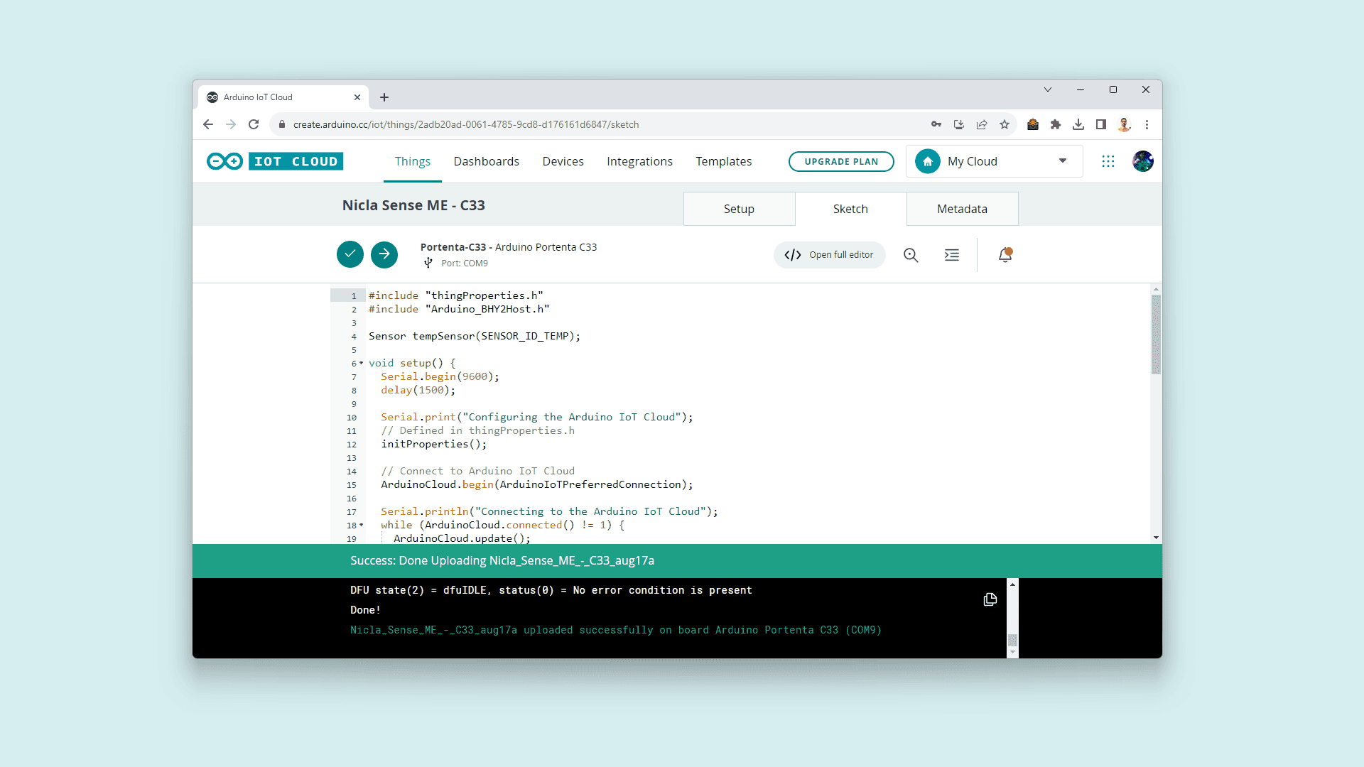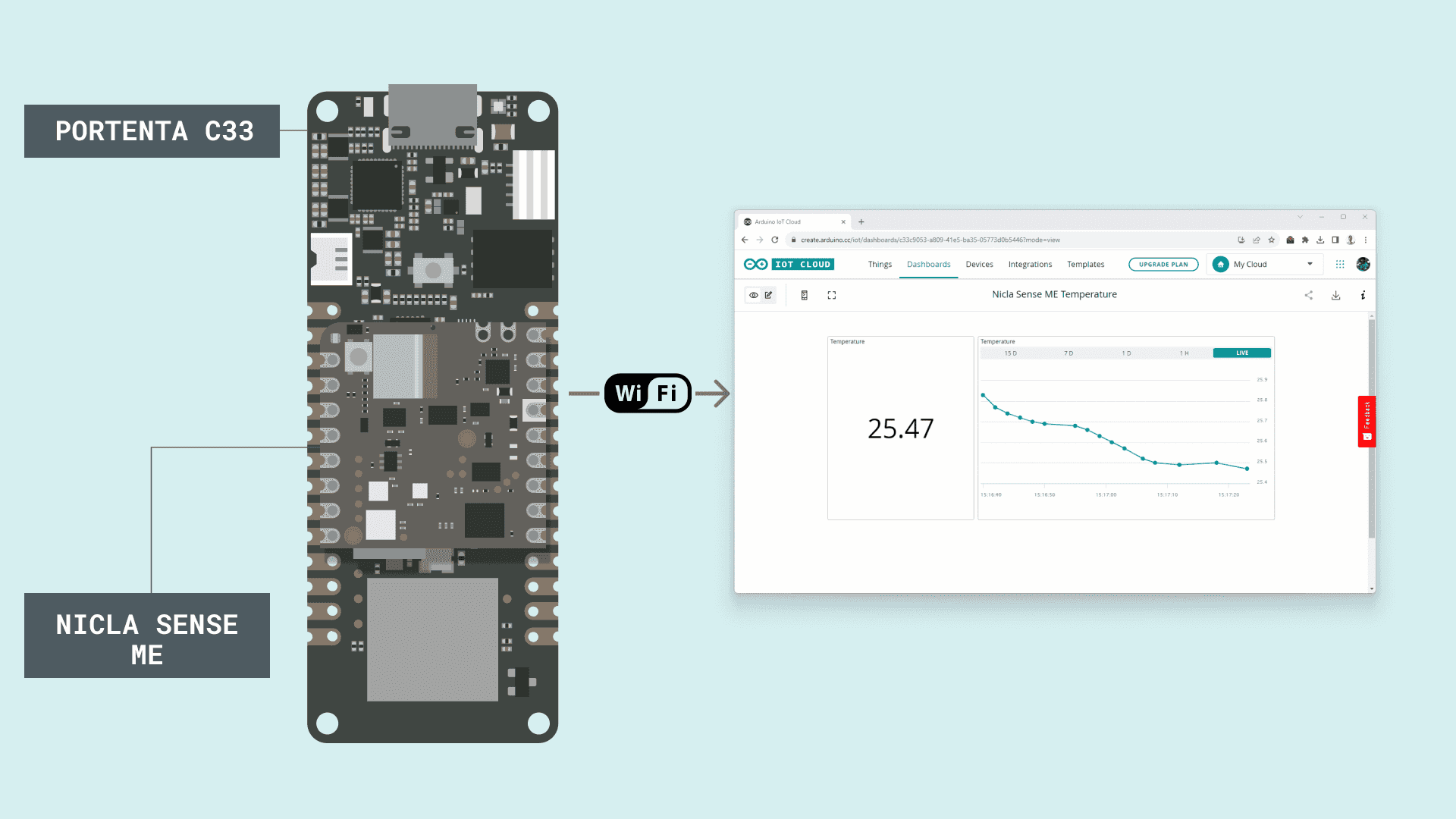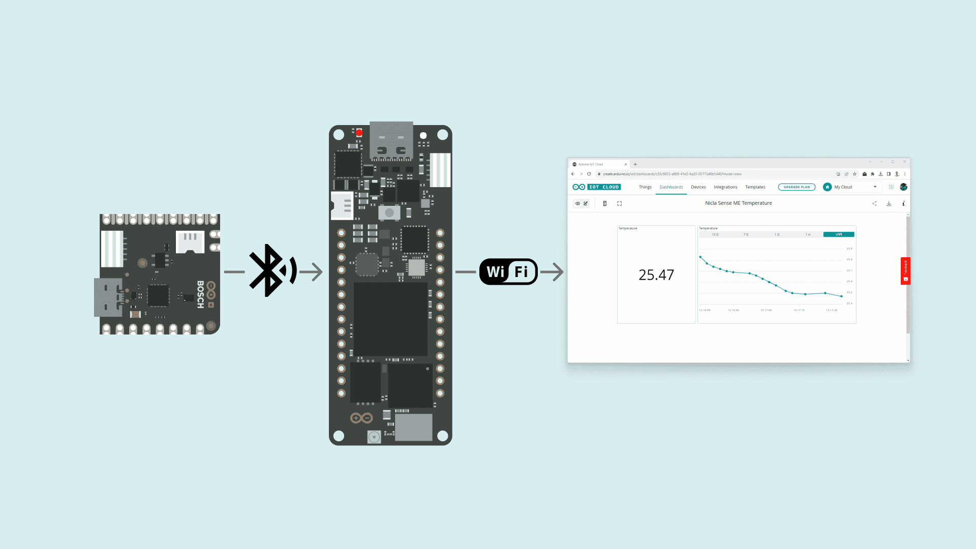 In this example, a Portenta C33 will be used as a gateway to forward Nicla Sense ME sensors data to the Arduino Cloud.