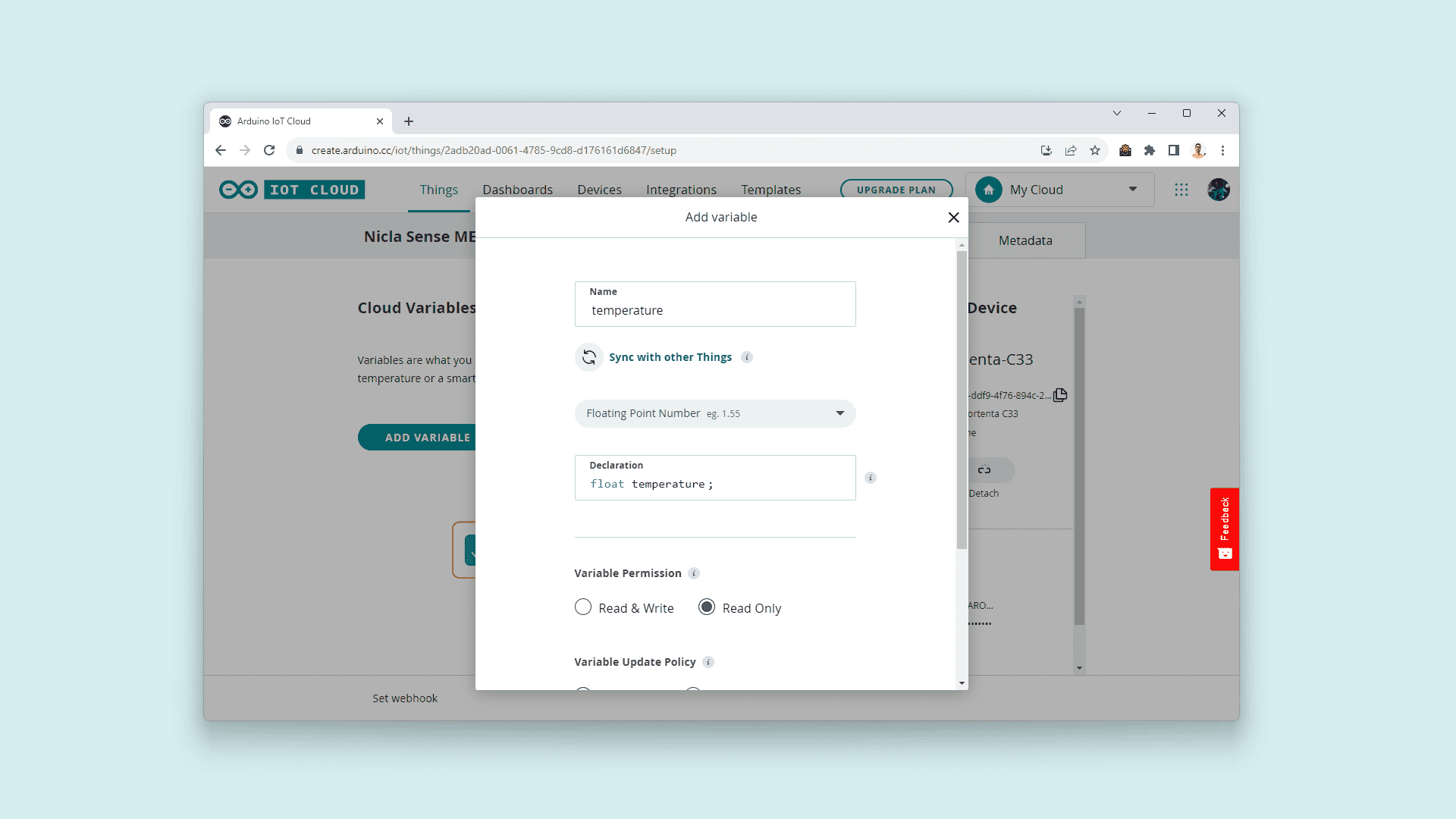 For a more detailed process on how to connect the Nicla Sense ME to the Arduino Cloud, follow this guide