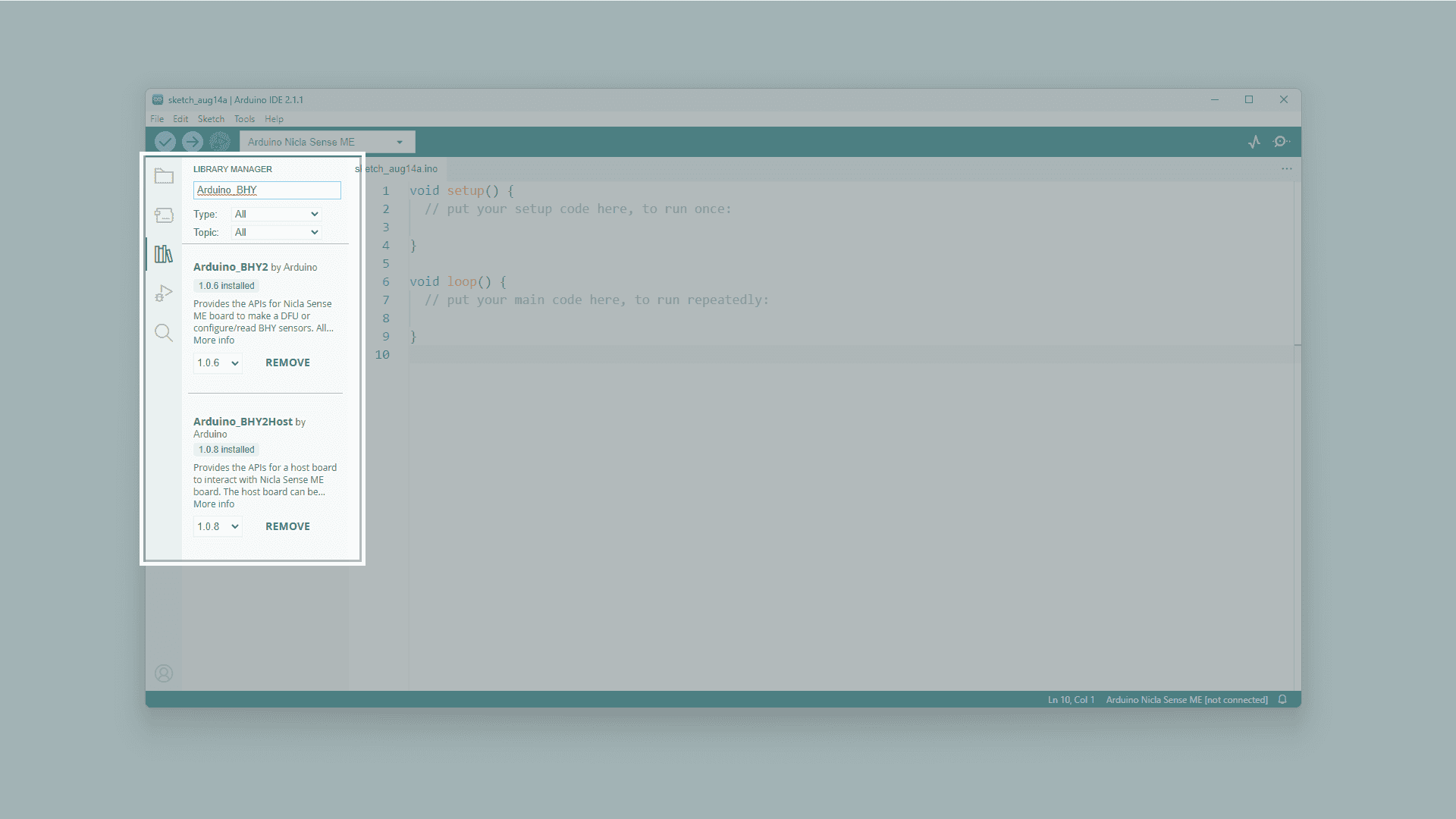 sketch. We will use this example to verify that the board is correctly connected to the Arduino IDE and that the Nicla Sense ME core and the board itself are working as expected. Copy and paste the code below into a new sketch in the Arduino IDE.