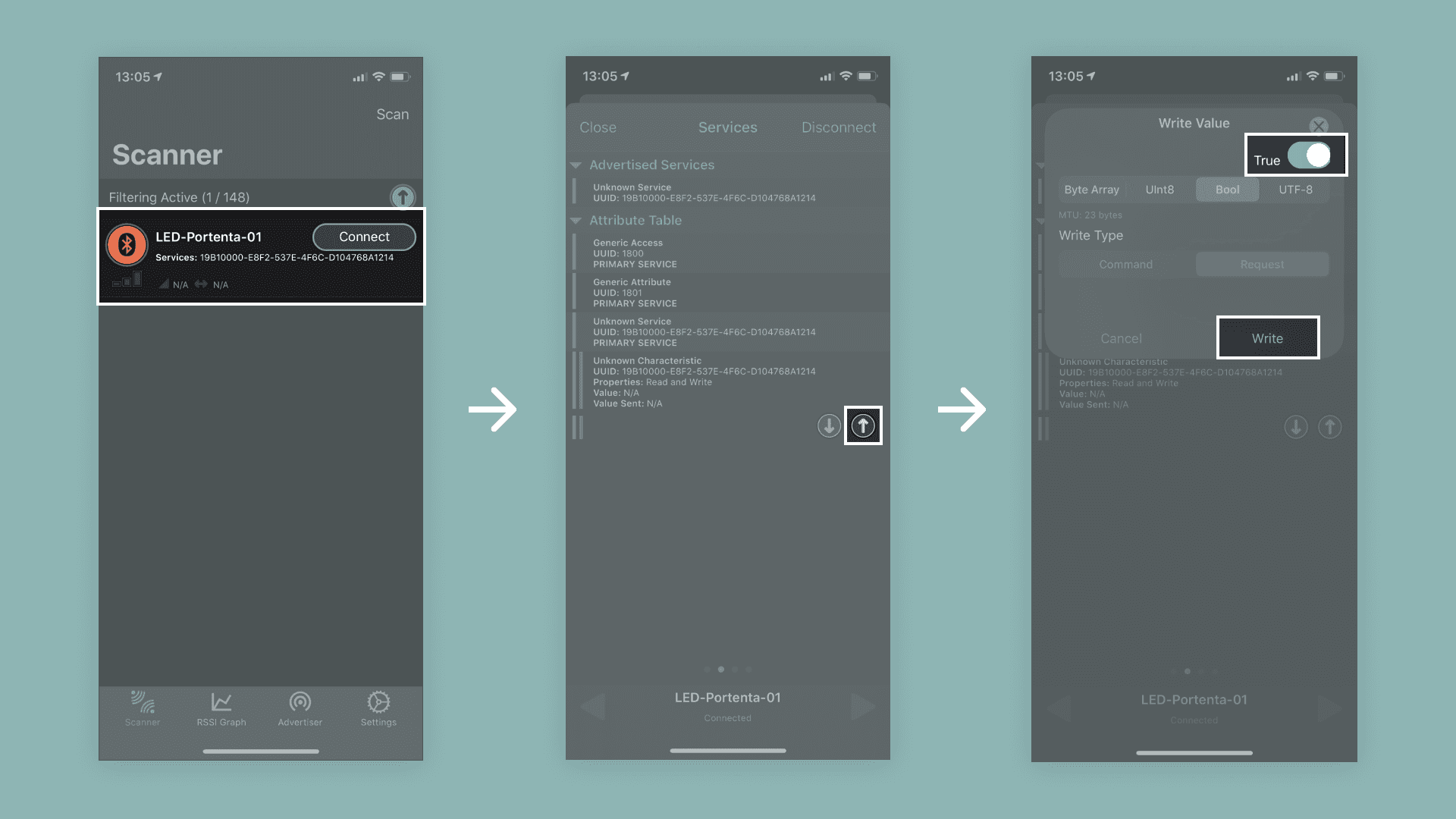 - Switch to "Bool" type and move the toggle to "True". Confirm the dialog with a tap on "Write" and you should see the built-in LED turned on. If you do the same procedure again but setting the toggle switch to "False", it will turn off the LED.