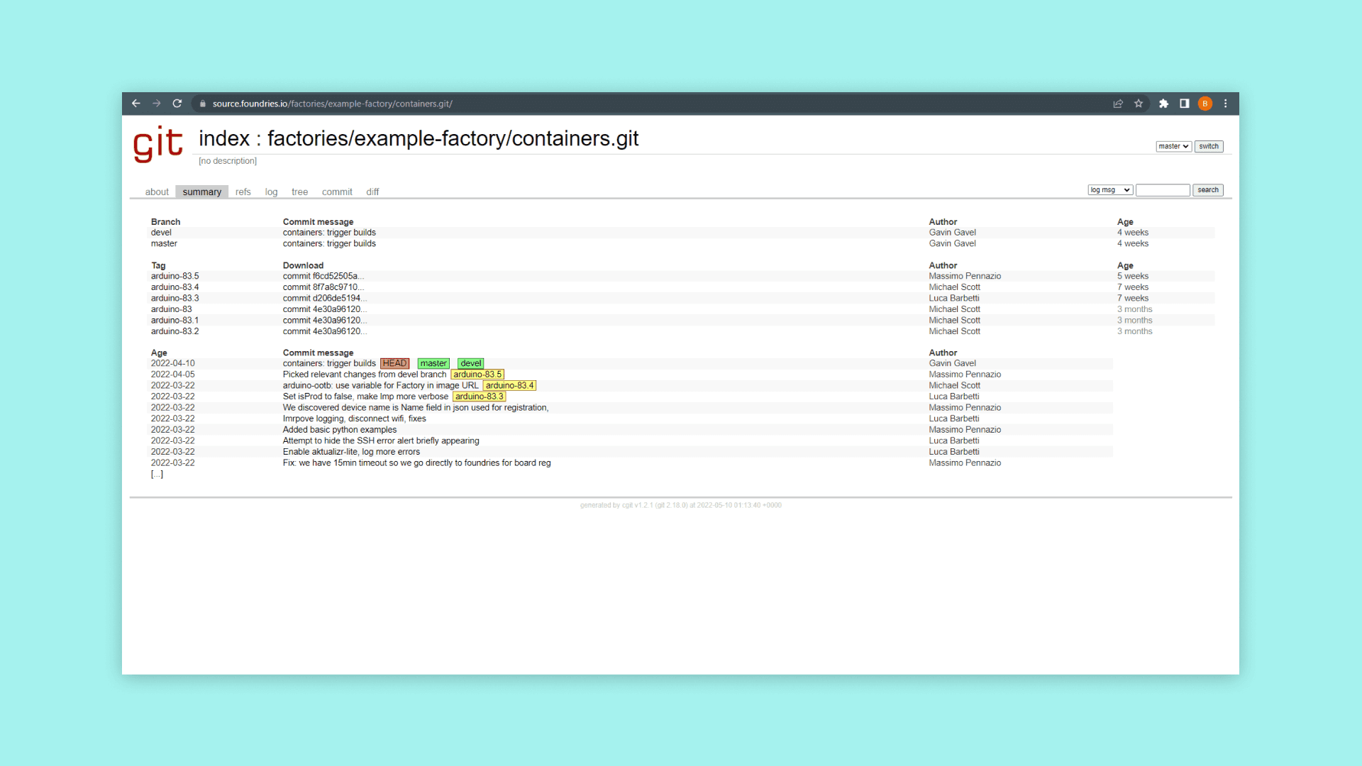 to finally push the changes to the repo. If you push the commit to "containers.git" a new target will automatically build on your FoundriesFactory, you can inspect it on the "Targets" page.