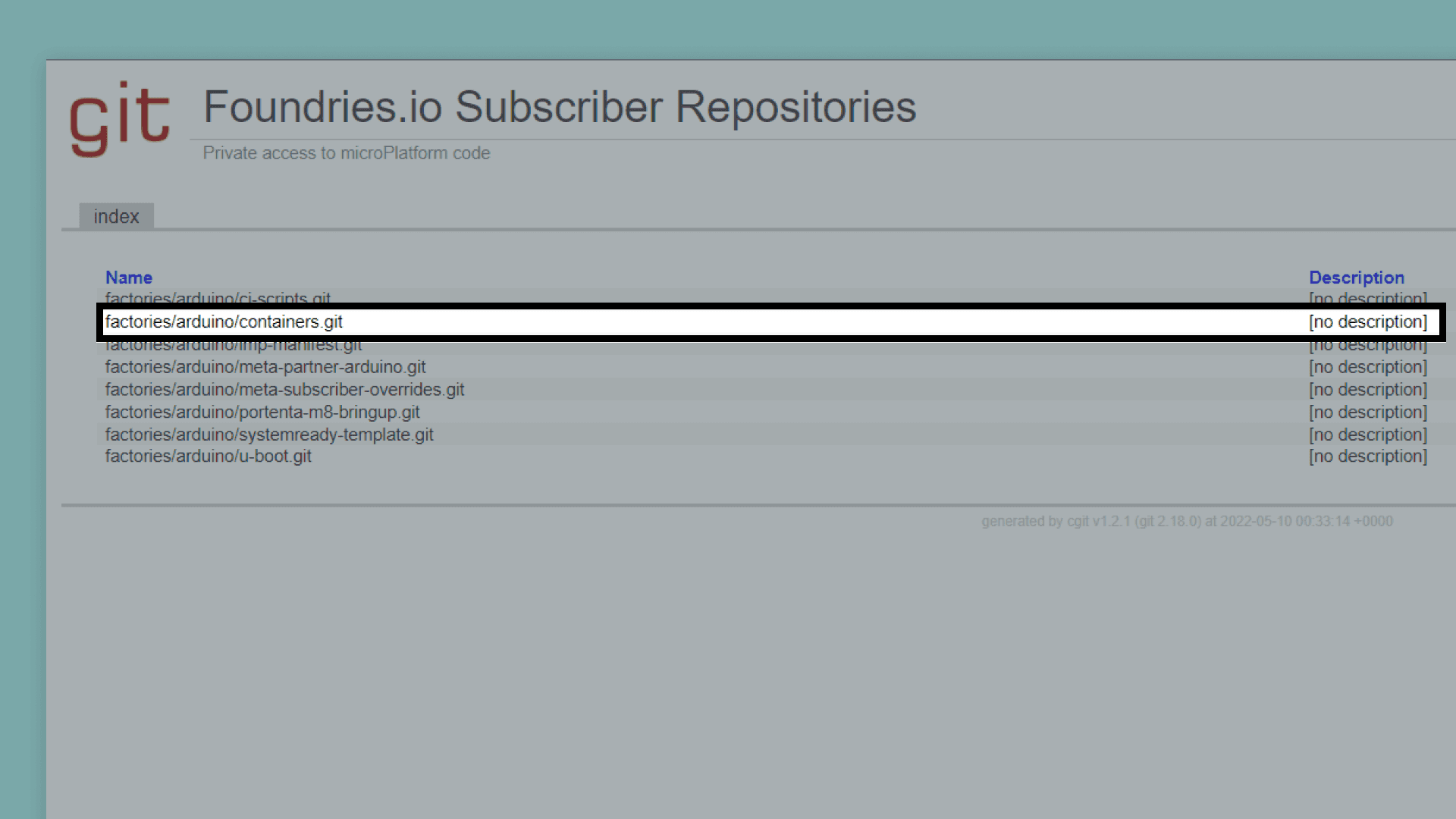 1git clone https://source.foundries.io/factories/YOUR_FACTORY/containers.git -b devel
