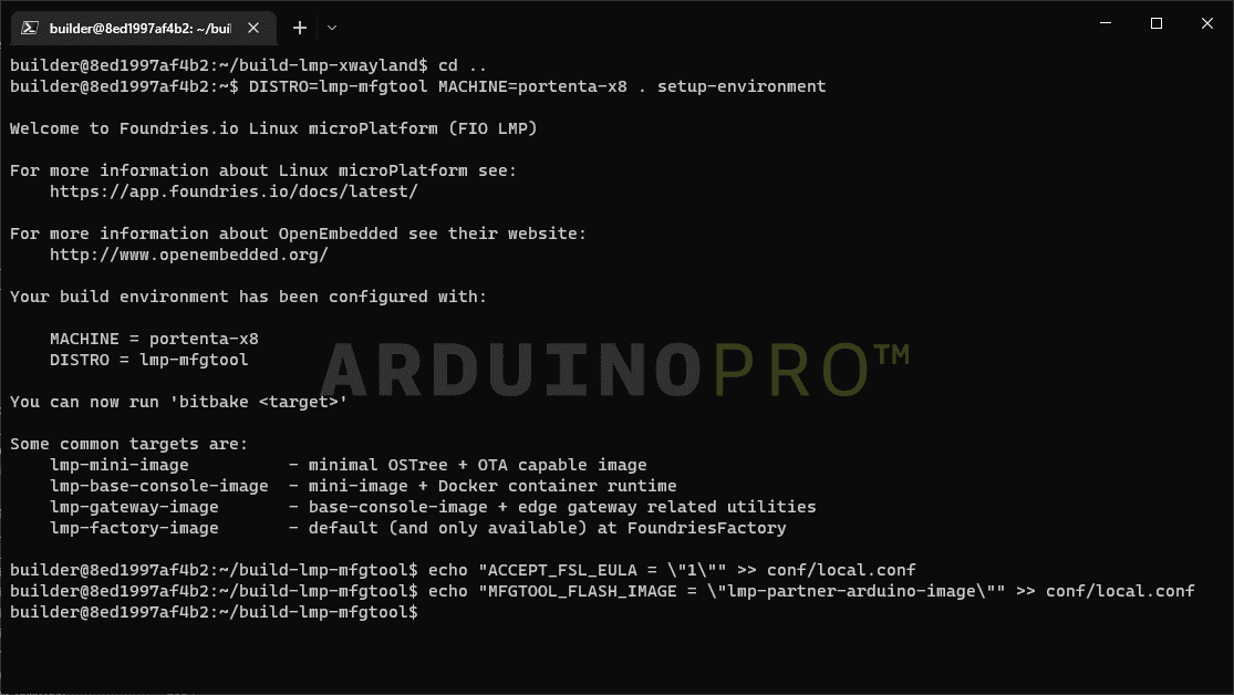 2DISTRO=lmp-mfgtool MACHINE=portenta-x8 . setup-environment