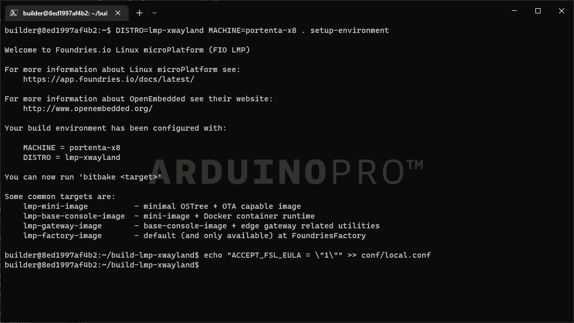 1DISTRO=lmp-xwayland MACHINE=portenta-x8 . setup-environment